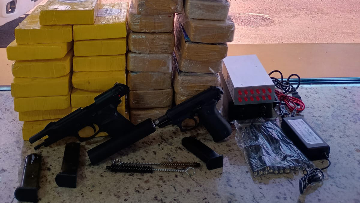 Além das drogas, foram localizadas duas pistolas, sendo uma delas equipada com silenciador, e um aparelho bloqueador de sinal, conhecido como “jammer” ou “capetinha”, utilizado por criminosos para impedir o rastreamento de veículos.