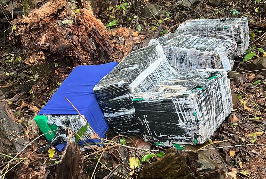 Uma equipe policial foi deslocada para o local e, durante a vistoria, localizou nove fardos de maconha escondidos entre a vegetação.