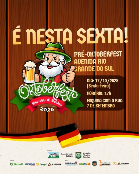 O aquecimento para a Oktoberfest de Marechal Cândido Rondon continua a todo vapor. Depois do sucesso da Pré-Oktoberfest na rua Santa Catarina, é a vez da avenida Rio Grande do Sul se transformar em palco de muita animação, música e cultura germânica nesta sexta-feira (17), a partir das 17h.