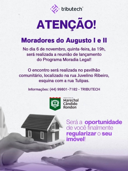 A prefeitura de Marechal Cândido Rondon, em parceria com o Tribunal de Justiça do Paraná, convida os moradores dos bairros Augusto I e Augusto II para uma reunião sobre o Programa Moradia Legal, que trata da regularização fundiária. O encontro acontecerá nesta quinta-feira, 6 de novembro, às 19h, no pavilhão comunitário da comunidade, localizado na rua Juvelino Ribeiro, esquina com a rua Tulipas.
