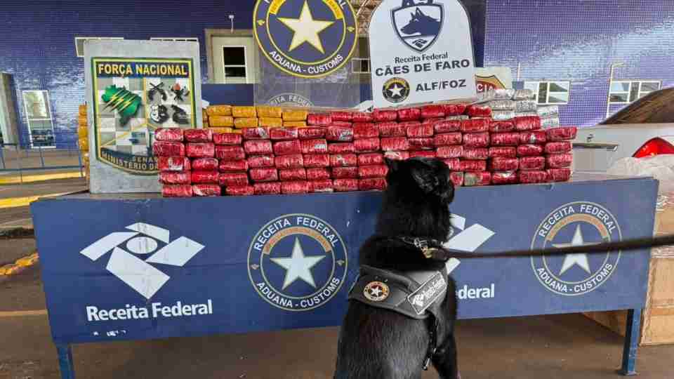 A inspeção indicou sinais de fundo falso no piso do veículo. Com apoio do cão de faro Echoes, foram encontrados 224 tabletes da droga, somando 166,9 kg.