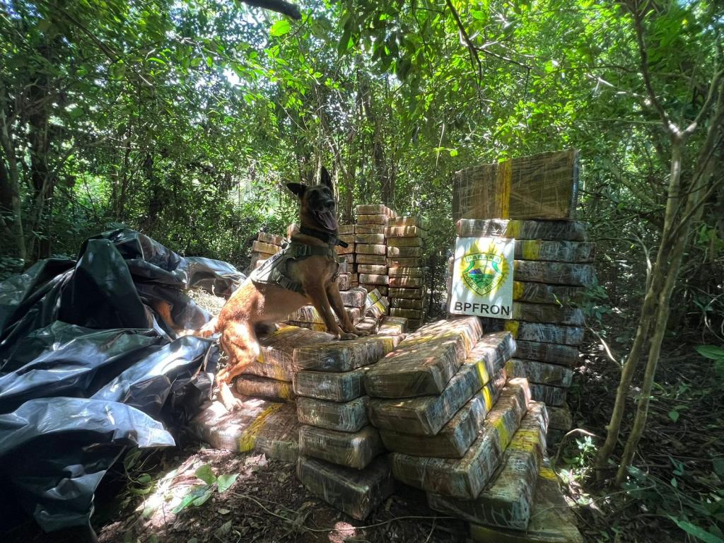 Em uma primeira ocorrência, equipes do BPFron localizaram cerca de 1,5 tonelada da droga escondida em uma área de mata após buscas com apoio de cão de faro.