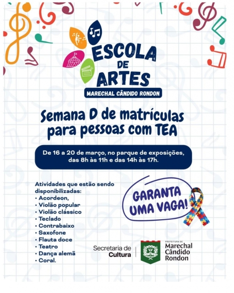 Para efetivar a matrícula, será necessário apresentar relatório médico; relatório do psicólogo; relatório escolar e documentos pessoais.A iniciativa busca ampliar o acesso de pessoas com TEA às atividades artísticas, promovendo inclusão, desenvolvimento cultural e social. Por isso, a orientação é que as famílias interessadas procurem a Escola de Artes durante a Semana D para garantir a matrícula nas atividades.