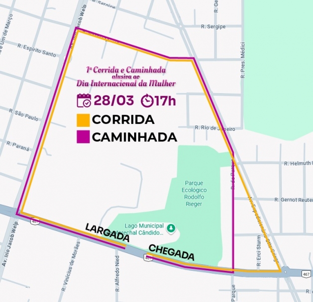 A prefeitura de Marechal Cândido Rondon, por meio da Secretaria de Assistência Social, realiza neste sábado, dia 28, a 1ª Corrida e Caminhada alusiva ao Dia Internacional da Mulher. O evento conta com o apoio da Câmara de Vereadores, Assemar, Conselho Municipal dos Direitos da Mulher Rondonense (Commur), Núcleo Maria da Penha (NUMAPE), Sicredi, Acimacar, Assemar, SAAE e Sesc.