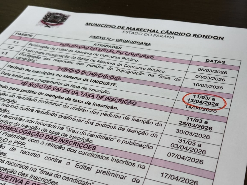 Quem deseja participar do Concurso Público nº 001/2026 da prefeitura de Marechal Cândido Rondon tem até segunda-feira, dia 13 de abril, para realizar a inscrição. O certame destina-se ao preenchimento de vagas, bem como à formação de cadastro de reserva em diversas áreas da administração municipal.