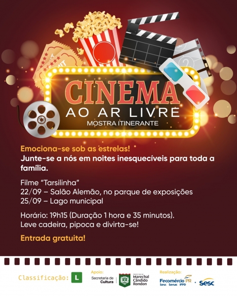 O Sesc, com o apoio da prefeitura de Marechal Cândido Rondon, por meio da Secretaria de Cultura, promove o Cinema ao Ar Livre para a comunidade, com a exibição do filme Tarsilinha. Haverá duas sessões: a primeira nesta segunda-feira, dia 22, que inicialmente estava programada para ocorrer no campo de futebol do Bairro Primavera, mas, devido à instabilidade do tempo, foi transferida para o salão alemão, no parque de exposições.