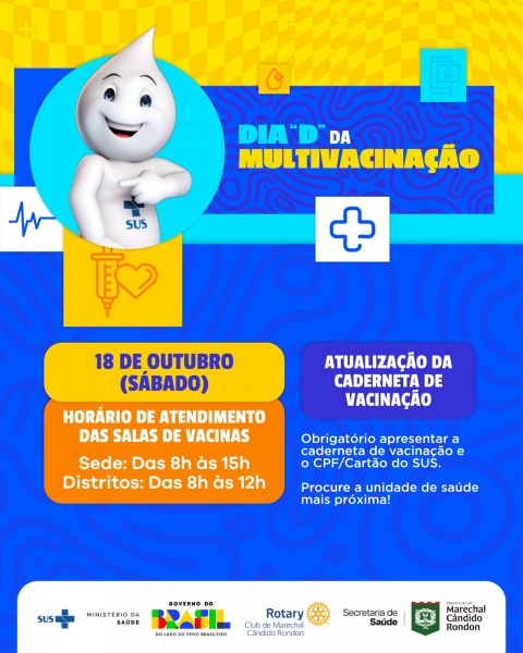 A prefeitura de Marechal Cândido Rondon, por meio da Secretaria Municipal de Saúde, realiza neste sábado, 18 de outubro, o Dia “D” da Campanha de Multivacinação 2025, com o objetivo de mobilizar pais e responsáveis para levarem crianças e adolescentes menores de 15 anos às salas de vacina do município e distritos.
