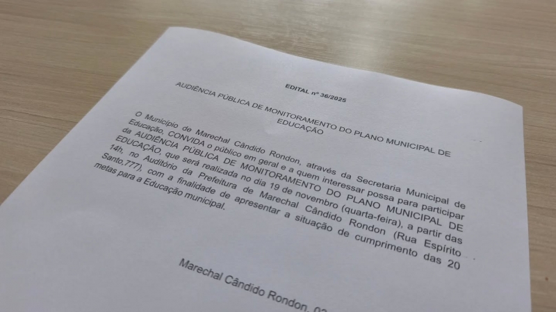 A Secretaria de Educação de Marechal Cândido Rondon convida toda a comunidade para participar da audiência pública de monitoramento do Plano Municipal de Educação, que será realizada na quarta-feira, 19 de novembro, a partir das 14h, no auditório da prefeitura.
