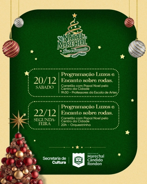 As celebrações natalinas de Marechal Cândido Rondon terão início no dia 6 de dezembro e seguirão até o dia 23, com uma programação especial preparada para toda a comunidade. Neste ano, o tema “Luz e Encanto” inspira as atividades, que incluem celebrações religiosas, apresentações culturais e a presença do Papai Noel, trazendo magia e acolhimento aos espaços públicos do município.