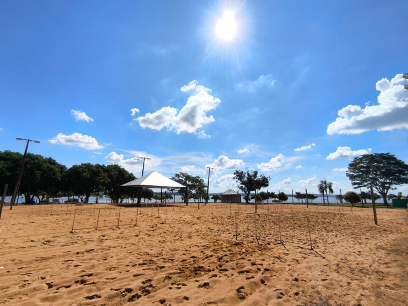 A quadra de areia está sendo preparada para receber o evento. A areia já foi previamente higienizada com 200 kg de cal. Também estão sendo feitas as demarcações das quadras de beach tennis (cinco quadras no total) e de vôlei de praia (duas quadras), além da área de arbitragem e coordenação, bem como toda a estrutura de arquibancada e som para quem irá prestigiar o evento.