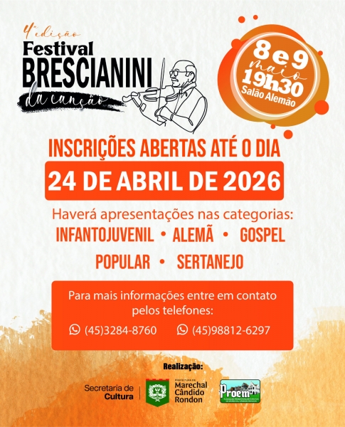 A prefeitura de Marechal Cândido Rondon, por meio da Secretaria de Cultura e da PROEM (Fundação Promotora de Eventos), está com inscrições abertas para o 4º Festival Brescianini da Canção, evento que busca valorizar artistas locais e regionais.