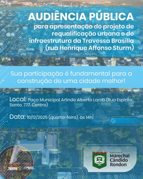 A prefeitura de Marechal Cândido Rondon, por meio da Secretaria de Planejamento, realizará nesta quarta-feira (10) uma audiência pública para apresentação do projeto de requalificação urbana e de infraestrutura da Travessa Brasília (rua Henrique Affonso Sturm) e do entorno da Praça Willy Barth. O encontro será às 14h, no auditório do paço municipal, localizado na rua Espírito Santo, 777.