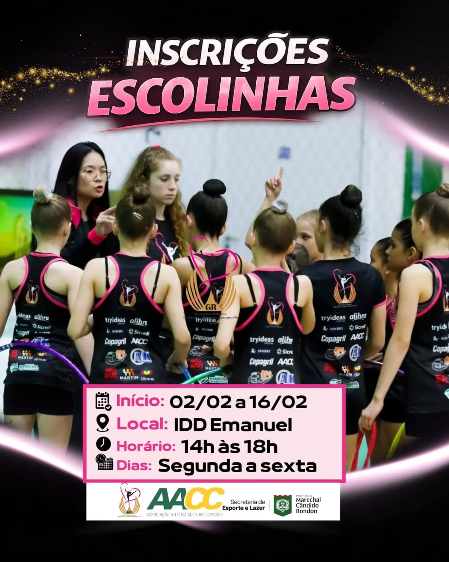 Para as inscrições nas escolinhas, não existe uma idade limite para o início no esporte, mas por se tratar de uma modalidade que demanda exercícios muito complexos, o ideal é o início em idades novas, pois se leva anos para construir a base de um atleta. As vagas são limitadas por turma e ocorrem entre os dias 02/02 à 16/02 (apenas nos dias úteis da semana), das 14h às 18h, na IDD Emanuel.