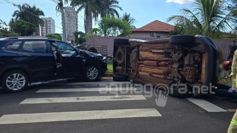 Um acidente de grandes proporções foi registrado na tarde desta quinta-feira (19) no cruzamento das ruas Pernambuco e 15 de Novembro, centro de Marechal Cândido Rondon. A colisão envolveu uma GM/Tracker e uma VW/Saveiro, que puxava uma carretinha carregada com pneus, resultando no tombamento do utilitário em plena via pública.