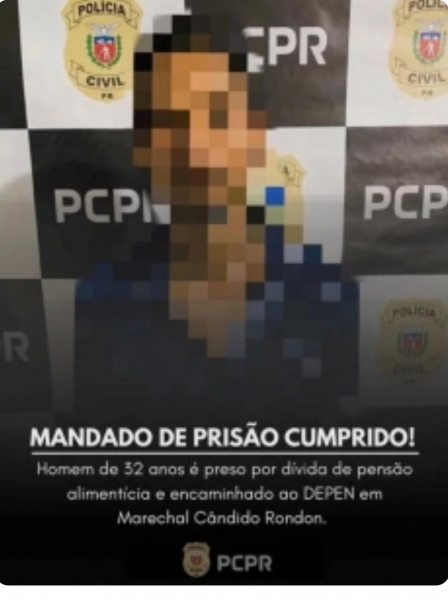 A Polícia Civil, por intermédio da 47ª DRP de Marechal Cândido Rondon, deu cumprimento a um mandado de prisão contra um homem de 32 anos, expedido em razão de dívida de pensão alimentícia.