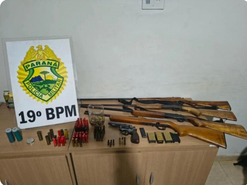 Durante buscas na residência, os policiais apreenderam 5 armas de fogo, entre espingardas de diferentes calibres e um revólver, além de uma grande quantidade de munições e materiais utilizados para recarga.