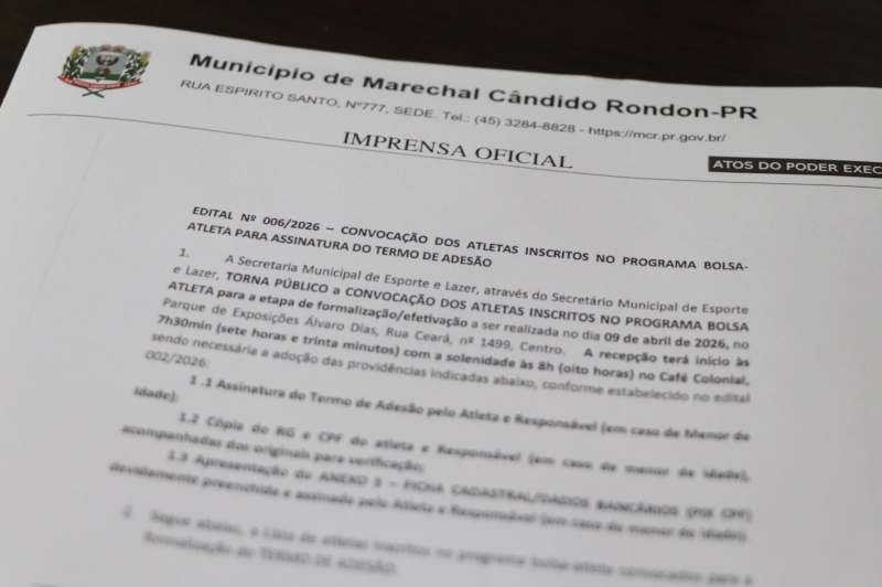 A prefeitura de Marechal Cândido Rondon, por meio da Secretaria de Esporte e Lazer, informa que a assinatura dos termos de adesão dos esportistas classificados no programa Bolsa-Atleta 2026 será realizada nesta quinta-feira (9), a partir das 7h30, no Café Colonial, localizado no parque de exposições.