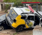 Viatura da PM atinge carro, ponto de ônibus e portão em Cascavel