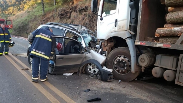 O automóvel tem placas de Francisco Beltrão e o caminhão, carregado com toras de madeira, seria de Queda do Iguaçu.