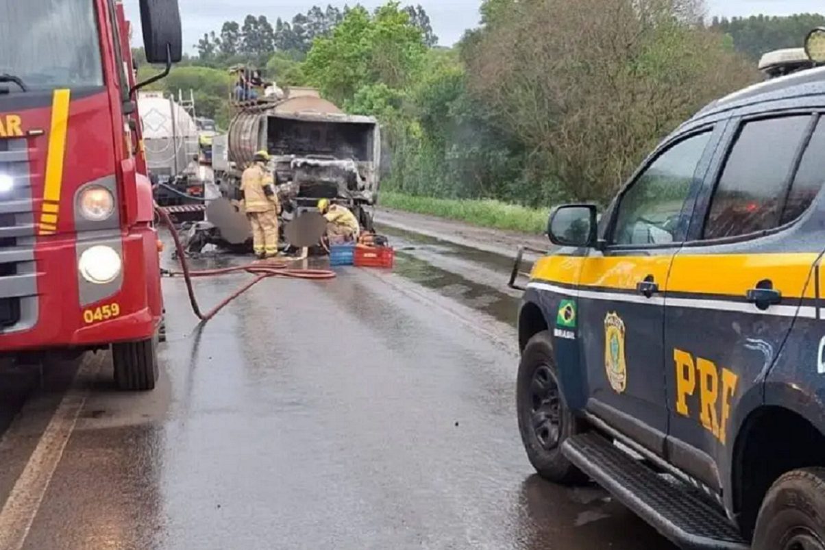 Segundo a Polícia Rodoviária Federal (PRF), o acidente ocorreu por volta das 14h50, em um trecho de pista simples da rodovia. Com a força do impacto, os dois veículos pegaram fogo e o automóvel, com placas de Panambi, foi completamente consumido pelas chamas.