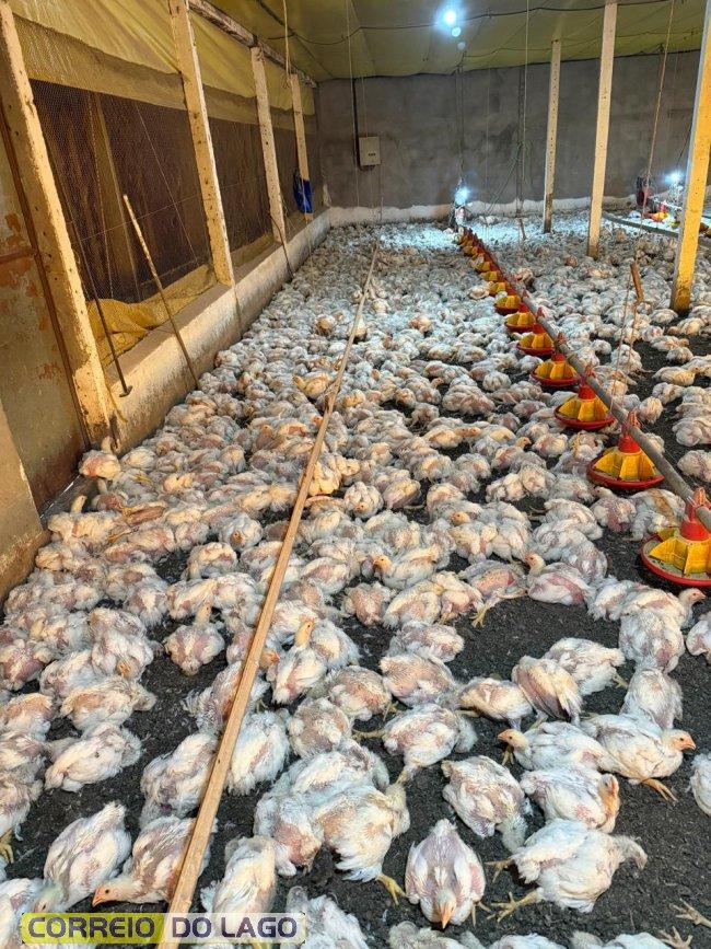 O gerador falhou e o sistema de ventilação não conseguiu manter a oxigenação no aviário. Segundo o produtor, quando o ambiente fica inadequado, as aves deitam e, com o superaquecimento, acabam morrendo.