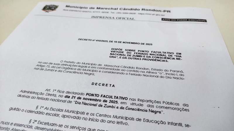 A prefeitura de Marechal Cândido Rondon declarou ponto facultativo nas repartições públicas da administração direta no dia 21 de novembro de 2025, em razão das comemorações do Dia Nacional de Zumbi e da Consciência Negra. As escolas municipais e os Centros Municipais de Educação Infantil manterão normalmente o calendário escolar aprovado no início do ano letivo.