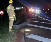 O veículo tombou e acabou parando sobre a ciclovia localizada às margens da rodovia.