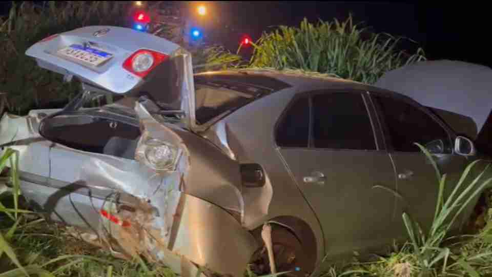 Com a força do impacto, o para-choque dianteiro do carro se desprendeu e ficou às margens da rodovia.