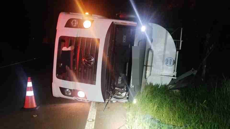 Caminhão Volkswagen Constellation 30.280 tombou e deixou homem ferido no km 599 da PR-364, entre Palotina e Terra Roxa, no Oeste do Paraná, na madrugada de terça-feira (20).
