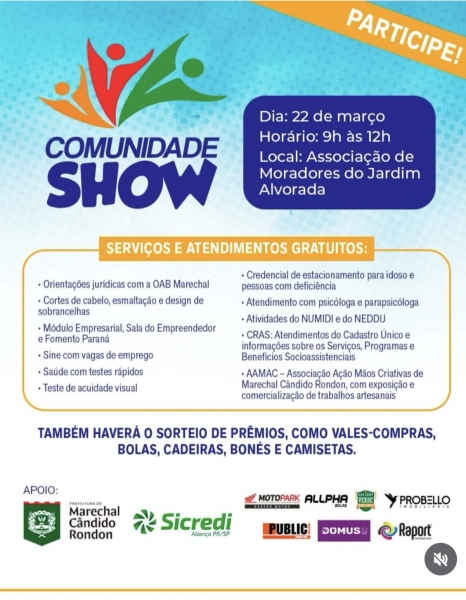 Acontece no próximo domingo, dia 22 de março, mais uma edição do Comunidade Show em Marechal Cândido Rondon. O evento será realizado das 9h às 12h, na Associação de Moradores do Jardim Alvorada.